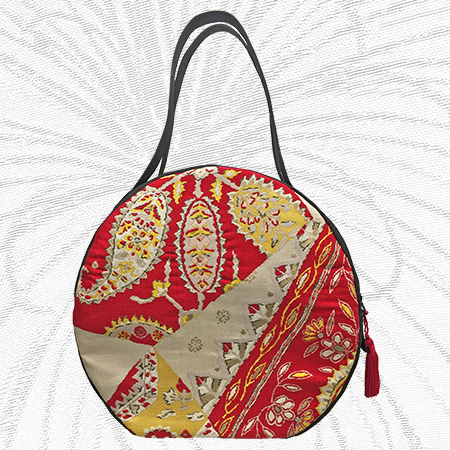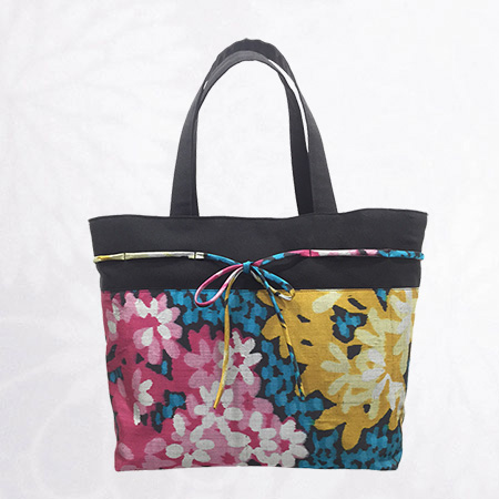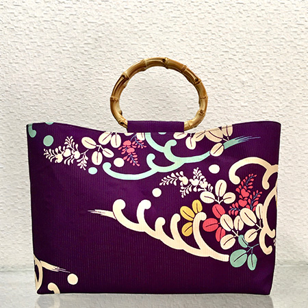 紫の糸で織り模様が入ったオフ白の絽の帯地で作ったトート