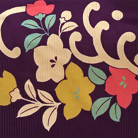 紫の絽に、ピンク、黄、白、青、等の花柄