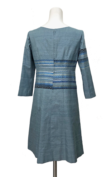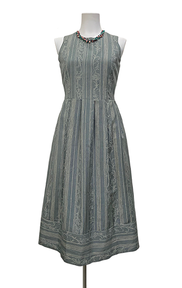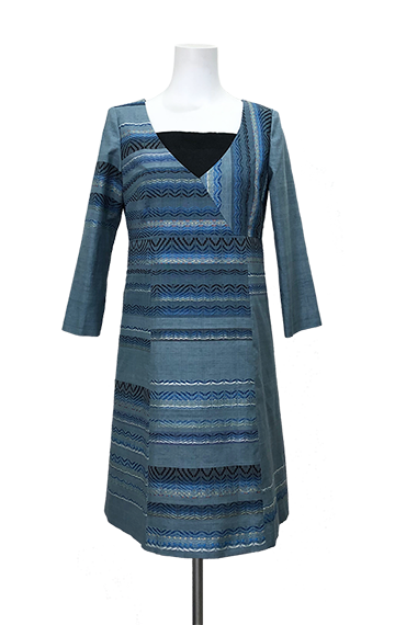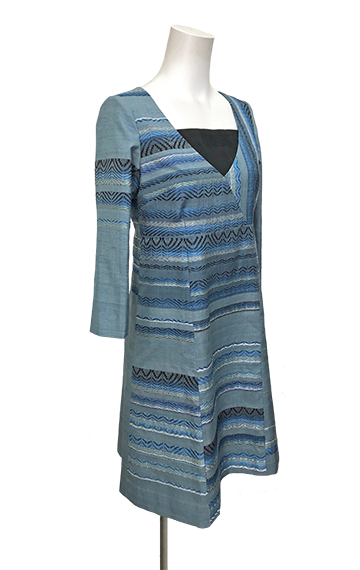 ボーダーの刺繍が入った紬の着物地ドレス